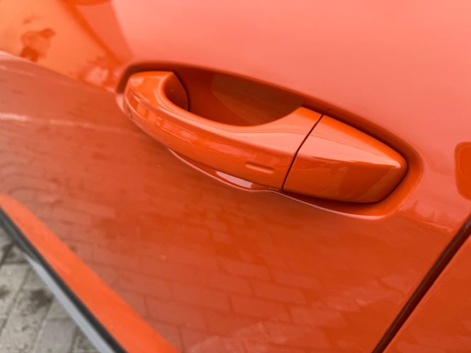 дверях спереди и сзади выполнены из материала Alcantara оранжевого цвета,